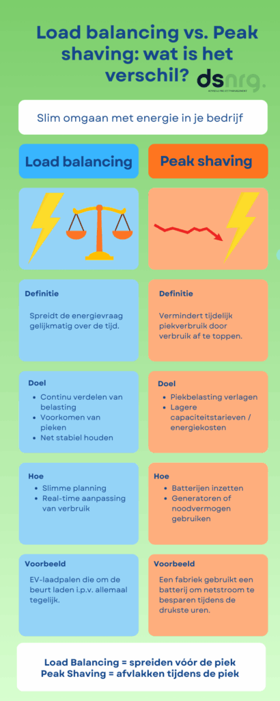 De druk op het elektriciteitsnet neemt toe. Bedrijven en instellingen worden geconfronteerd met stijgende energiekosten en een netwerk dat steeds vaker tegen zijn grenzen aanloopt. Twee oplossingen die hierbij steeds meer aandacht krijgen zijn load balancing en peak shaving. Maar wat is nu eigenlijk het verschil?